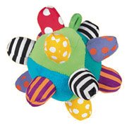 Bright colors and bold patterns help engage baby's developing sense of vision;Easy-to-grasp bumps help baby hold and toss or roll the ball;Clear plastic ends contain multiple color beads that make rattle noise;Attract baby's attention with variety of color;Soft ball construction is appropriate for baby's environment