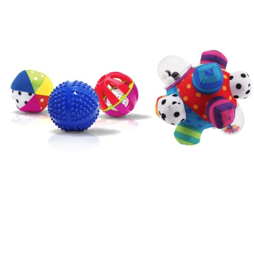High-contrast patterns help promote development of baby's vision;Graspable areas allow baby and parent to shake toy and introduce rhythms while the bump ball has a Easy-to-grasp bumps help baby hold and toss or roll the ball;Different textures provide variation to the play experience;Set of 4 balls: 1 plush, 1 hard plastic with rattle, 1 soft textured plastic and 1 bump ball