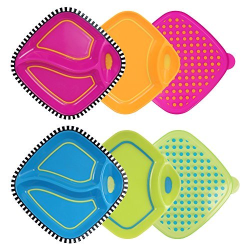 6pc set includes two divided plates, two standard plates, and two Snap-On lids, Non-skid areas keep plates from sliding on table, Non-skid borders in eating area help child get food on utensil