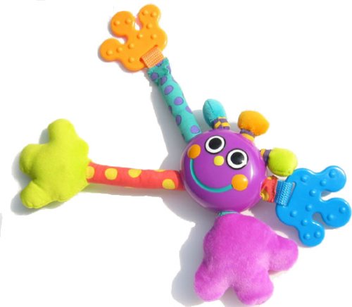 Sassyのハグ・アンド・タグ。手足をひっぱると伸び縮みする。両足とも触ると音がなる。まんまるお目目がかわいいカラフル・ポップなデザイン。両手は歯固めになる。さまざまな仕掛けは赤ちゃんの興味を刺激する。