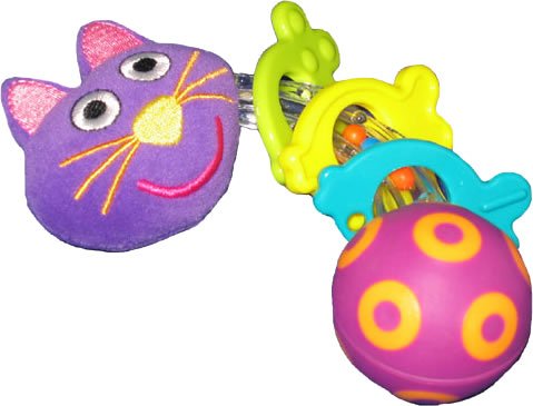 やわらかな布で仕上げた子猫には、ビーズの動くボディと歯がためのリング、握って振るとおさかなのリングが当たって、カラカラ音がします。これ1つでお楽しみ盛りだくさん。五感を刺激する仕掛けが、いっぱいのラトル。 ビビッドカラーと刺しゅうの大きな目玉も赤ちゃんの興味を引き付ける要素です。