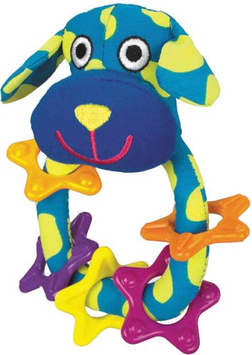 子イヌのラトル。リングには星形の小さなリングが。振るたびに優しい音でベビーも安心。おしゃぶり、にぎにぎ、振ってといろいろな音に興味しんしん。赤ちゃんの一日の生活の中で一番身近にいてくれてかわいい話相手に、また適度な歯がためにある程度の大きさと重さのラトルは赤ちゃんの指の力を強くし、右脳の刺激にも効果大。