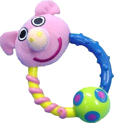 話しかけたくなるような子ブタ君。緑のポールもカラカラ鳴って、ぐずっているベビーを優しくあやしてくれる。おしゃぶり、にぎにぎ、振ってといろいろな音に興味しんしん。赤ちゃんの一日の生活の中で一番身近にいてくれてかわいい話相手に、また適度な歯がために。ある程度の大きさと重さのラトルは赤ちゃんの指の力を強くし、右脳の刺激にも効果大。