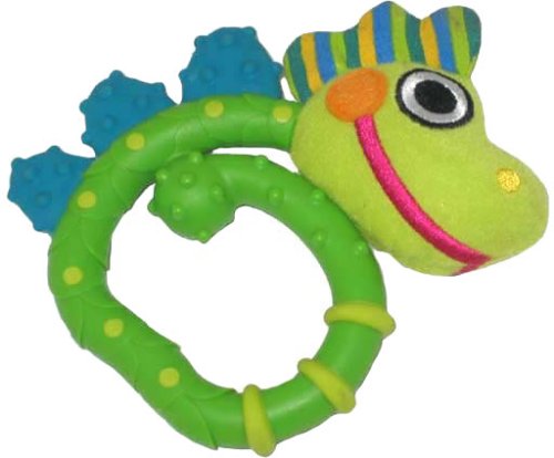おしゃぶり、にぎにぎ、振ってといろいろな音に興味しんしん。赤ちゃんの一日の生活の中で一番身近にいてくれてかわいい話相手に、また適度な歯がために。ある程度の大きさと重さのラトルは赤ちゃんの指の力を強くし、右脳の刺激にも効果大。大きな瞳とにっこり笑顔のドラゴンの、くるっとまいたしっぽは歯がために。背中の青い三角もカミカミして。振って、にぎって、楽しい。