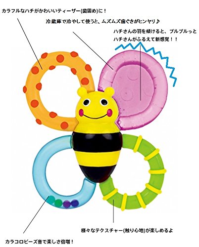 大人気のバンブル・バイツが進化。羽の部分をかぷっと手前に傾けるとブルブルと振動、まるで虫が飛んでいるような“ブーン”という音にも聞こえる。赤ちゃんのムズムズするお口を程よく刺激する。なお、柄は2種類ございますが、ご選択いただくことはできません。