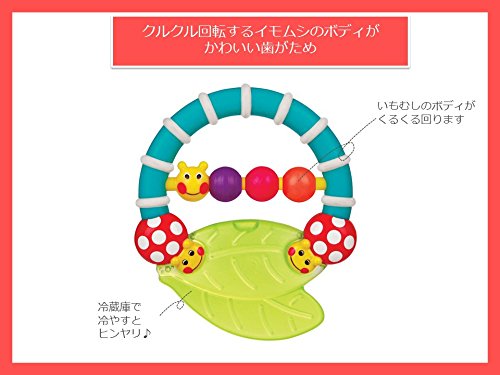 ムシさんがむしゃむしゃと食べる葉っぱの部分は、冷蔵庫で冷やすとクールな歯がために。歯が生え始めの頃のむずむずに気持ちイイ! イモムシのボディはクルクルと回る。