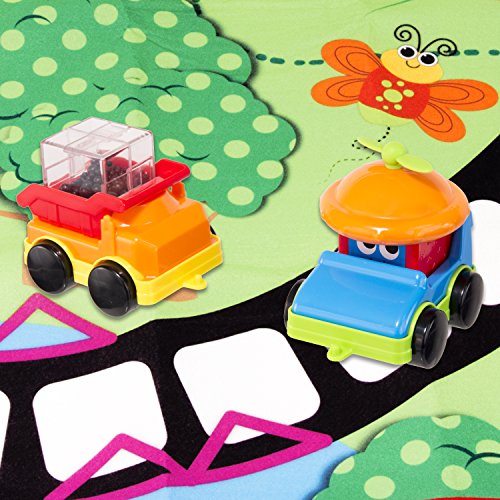 35 x 30 Fully printed vibrant mat;Includes vehicles and mat;Creates a clean space for baby to play with blocks, cars and toys;Provides great space for imaginary play and story telling;Mat is machine washable