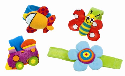 マジックテープで赤ちゃんの手足につけると、振れる度にカラカラと音がするリストラトル。おもちゃを握れない月齢の小さい赤ちゃんも、耳を澄まして音を聞いたり、見つめたりして楽しめる。ネコ&ネズミの2種類の動物で、お話したり音を聞き分けたり。赤ちゃんをあやしてあげるときもぴったり。