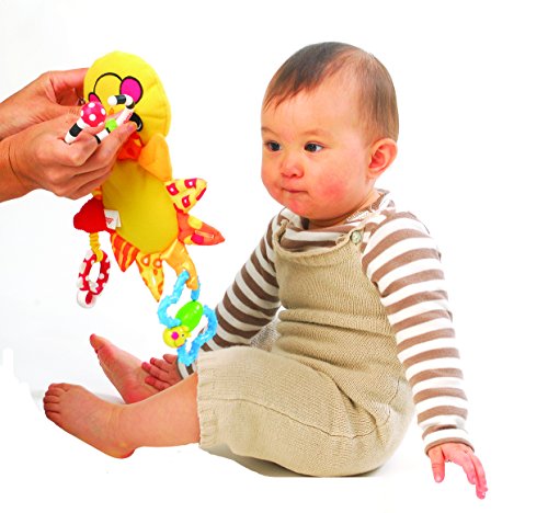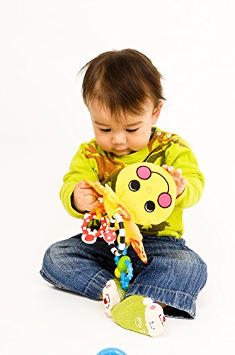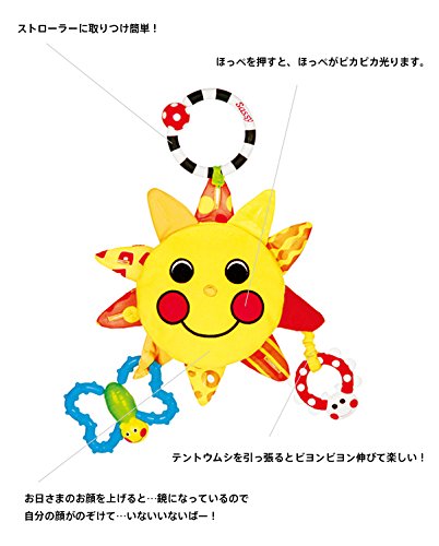 ベビーカーやベビーベッドに大きなリングを取り付けて。 いつもお日さまの笑顔が赤ちゃんを見守ってくれる! お鼻を押すとほっぺがピカピカ! めくると鏡で「いないいないばあ」も。ちょうちょとかめさんの歯がためや、赤ちゃんの大好きなカシャカシャ音がいっぱいの楽しいお友達になるよ!