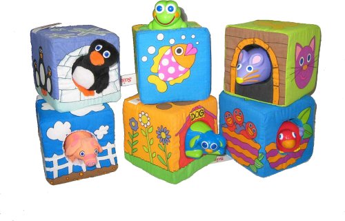 6種類の動物たちがそれぞれのライフスタイルを表す立方体に、入っている。立体物は軽く、赤ちゃんが手に持ってきちんと握れる。どうぶつは素材が異なり振るとカラカラ鳴ったり、と単独でも充分楽しめる工夫がされている。