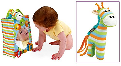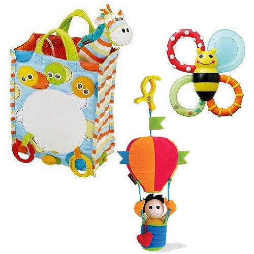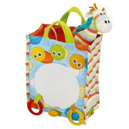 - ①Yookidoo にっこりミラー:音と光のミラー付バッグ。大好きミラーとマスコットのキリンをお供にミルクボトルを入れてお出かけ。(0ヶ月~)