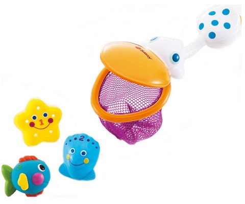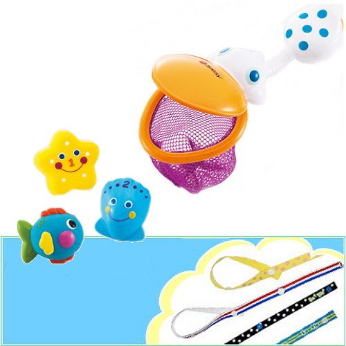 - ★ペリカンのくちばしは、すくうだけじゃなくて、おさかなたちをしまうこともできます。おさかなのおなかを押すと水でっぽう!ヒトデはシャワーに、貝でお水をすくえます。(9ヶ月~)