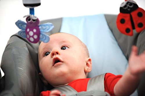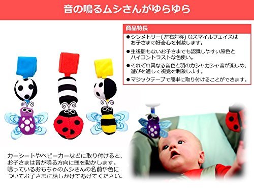 Sassy attachable Go Go Bugs inspires hearing with high contrast colors and textures, symmetrical faces of fun butterfly, bee and ladybug. Each toy has distinct sounds to encourage baby to seek source of sound. All attachable are easy to move and provide great visual and auditory stimulation for baby. Great for newborns, attach to carrier or car seat or stroller
