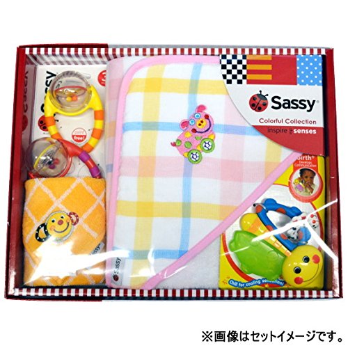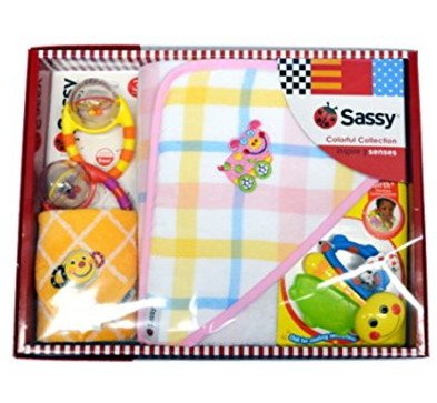 プレゼント・ギフトに最適。カラフル・かわいい・実用的!サッシーのおくるみ入りのいギフトセット。