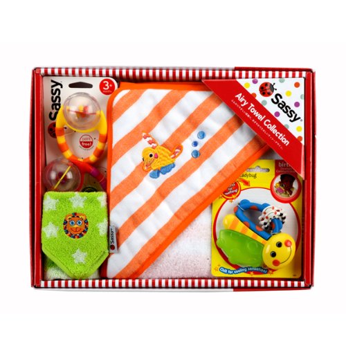 - 世界のママに愛されている「Sassy」のギフトセット。実用的なおもちゃ、おくるみ、ミニタオルが入っています。
