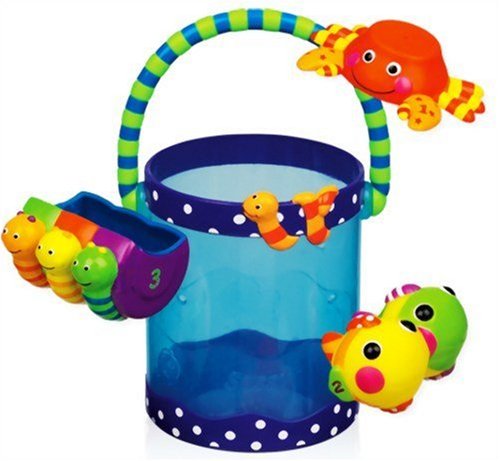 持ちやすい取っ手のついたミニサイズのバケツ。軽いので小さいお子様にもぴったり。カニさんが1匹、おさかなさんが2匹、カタツムリが3匹同じ数の穴があいているのでお水の筋(すじ)をみてお話も広がり、楽しみながら数字に親しむ心を育てる。おさかなさんは水鉄砲、カニさんやカタツムリでお水をすくってパシャパシャ遊びも。キュートなミニバケツはお砂場でも活躍。