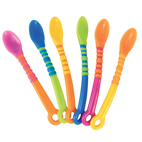 Set of 6 spoons, BPA Free;Durable plastic handle with soft spoon bowl;Correctly sized to keep bites more manageable;Soft spoon bowl is easy on gums and provides tactile oral feedback;Long handle is easy for caregiver to hold