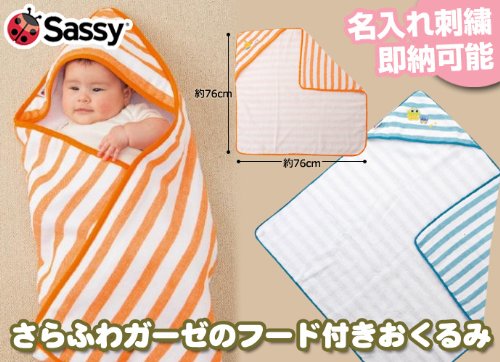 ☆Sassy さらふわガーゼ・フード付きおくるみ 別途刺繍チケット購入でおくるみへの名入れ刺繍が可能です☆ フードのコーナー部分についたSassyキャラクターがポイント 表地はサラっと肌触りの良いガーゼ素材で、裏地はやわらか無撚糸のパイル素材。 フードつきだから、お風呂あがりや外出時にも活躍します。