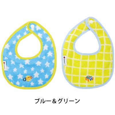 フワフワタオルのビブ。 スナップボタンで2段階調節可能です。