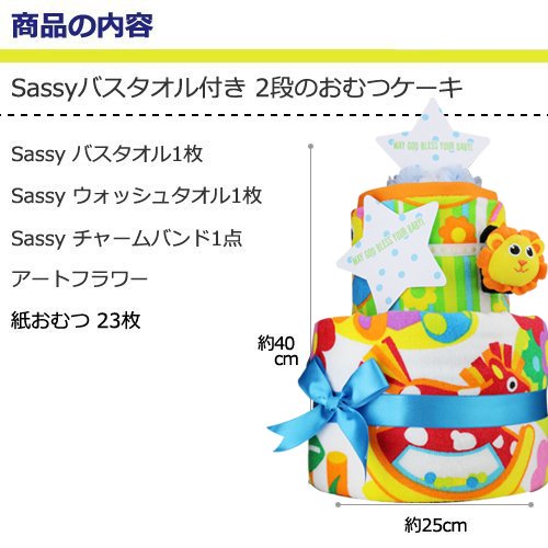 - Sassyタオルやおもちゃがついた大人気おむつケーキ