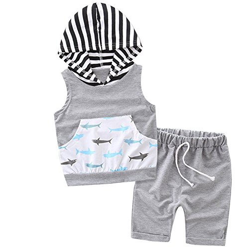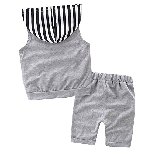 新生児の赤ん坊の男の子の幼児2本のストライプのノースリーブのパーカー+ショーツの服セット夏の服 (90)