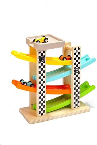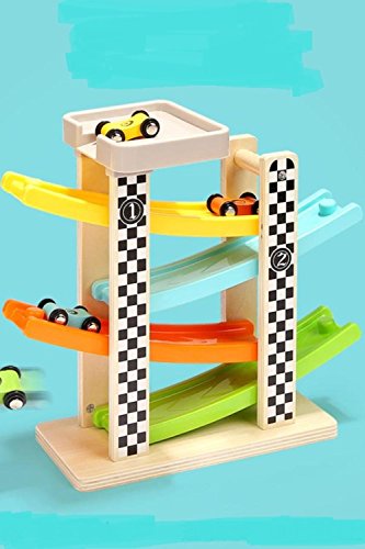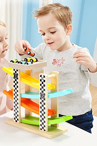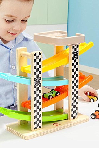 (SCGEHA) 木製 車 スロープトイ ミニカー 滑り台 木のおもちゃ 知育玩具 子ども 車4台付き