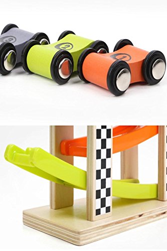 - 4色のレールと車にチェッカーフラッグ模様の柱。カラフルなデザインがパッと見ただけで小さなお子さまの興味をひきつけます。部分的に天然目を使用しているので木のぬくもりも感じられるアイテムです。