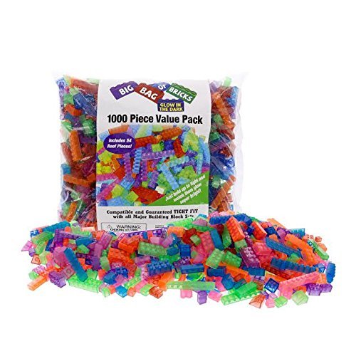 Compatible Building Bricks - Big Bag of 1000 Assorted Glow in the Dark and Neon-colored Bricks - Guaranteed Tight Fit - For Less: Dont pay more for bricks when all you want is a bunch of building blocks for less. Not only are these bricks ultra tight fitting, but they contain the building bricks you want - NOT a bag of just small worthless pieces. Furthermore , this bag comes with the basic colors PLUS hard to find colors, and bonus roof tiles for added playability