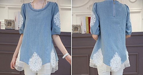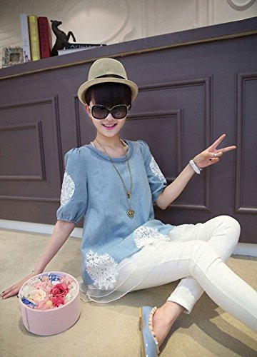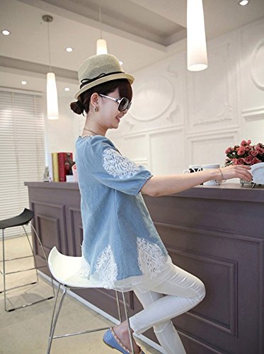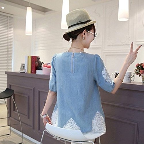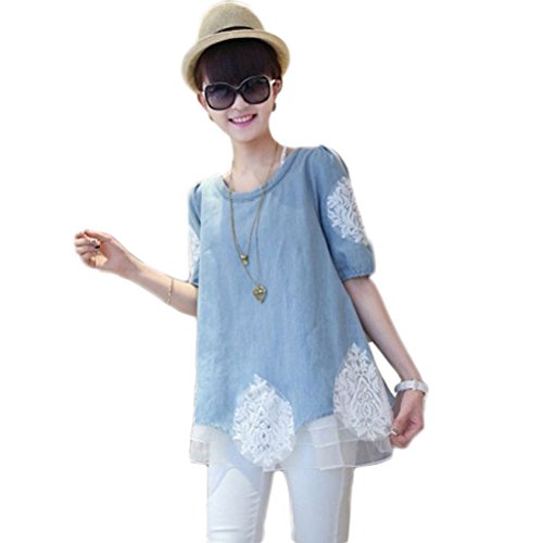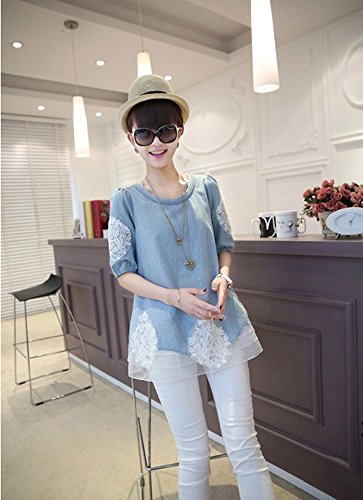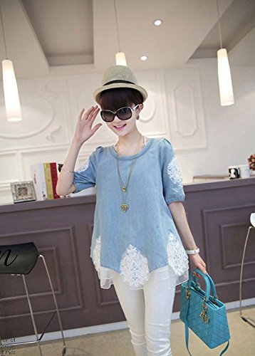 【SEBLES】マタニティ 妊婦 妊婦服 トップス カットソー 半袖 デニム レース ラウンドネック Aライン お洒落 大人可愛い エレガント(XXL)