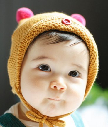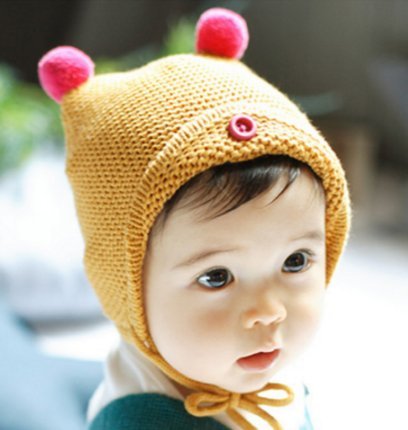- フロントのボタンとトップがかわいい、ベビーニット帽です。