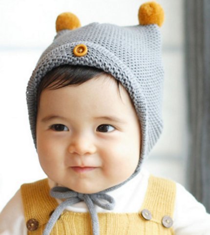 - フロントのボタンとトップがかわいい、ベビーニット帽です。