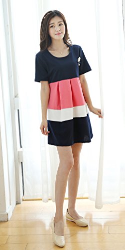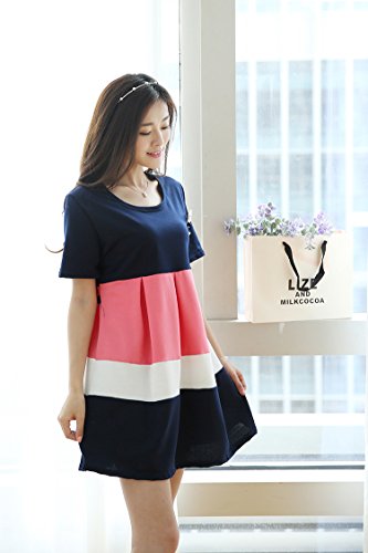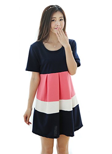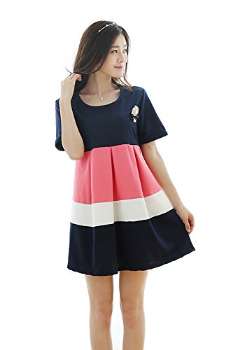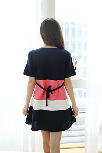 【SEBLES】マタニティ ファッション ワンピース カジュアル フレア スカート リボン ボーダー ラウンドネック ハイウエスト ミニスカート 半袖 初夏 夏(ピンク,XXL)
