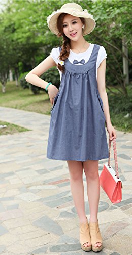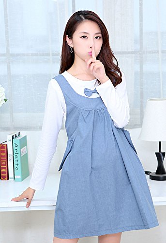 【SEBLES】マタニティ 妊婦 ファッション ワンピース カジュアル フレア スカート リボン 無地 コットン ポリエステル ラウンドネック ハイウエスト スカート 半袖 長袖 春 初夏 夏(ブルー長袖,XXL)