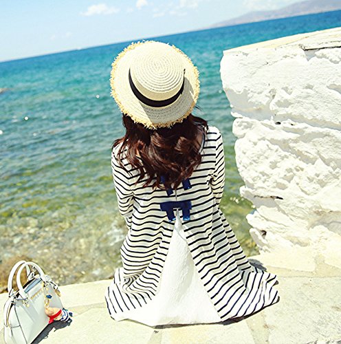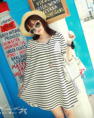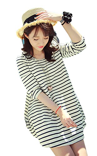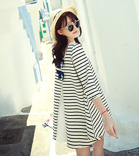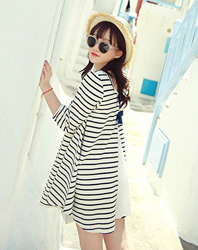 【SEBLES】マタニティ 妊婦 ファッション ワンピース カジュアル ボーダー ネイビー ホワイト フレア スカート リボン コットン 綿 ラウンドネック 七分袖 春 初夏 夏 大人可愛い(XXL)