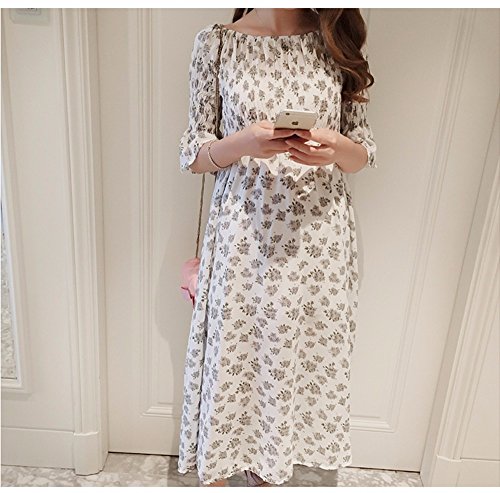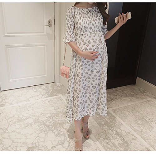 【SEBLES】レディース マタニティ ロングワンピース 花柄 五分袖 袖フレア 胸ギャザー 夏 ホワイト フリーサイズ