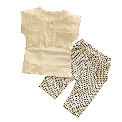【SEBLES】ベビー 赤ちゃん 女の子 男の子 ユニセックス 半袖 ラウンドネック 無地 ポケット Tシャツ チェック ズボン ボトムス パンツ セット ツーピース コットン 綿(タイプB,90cm)