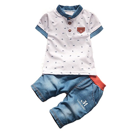 【SEBLES】ベビー 赤ちゃん 男の子 半袖 バンドカラー ポロシャツ 柄 デニム風 パンツ ズボン ボトムス コットン 綿 コットン ツーピース セット 夏 春(タイプA,120cm)
