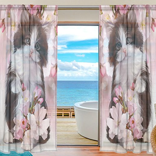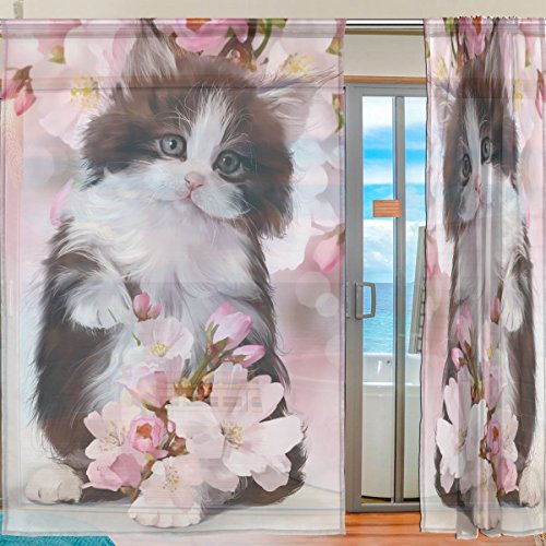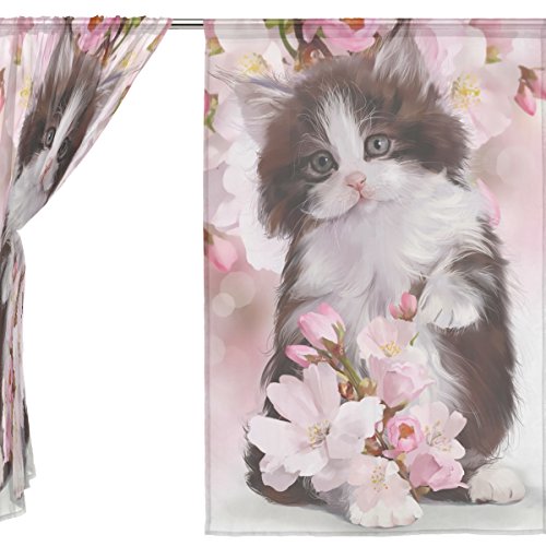 seulifeウィンドウ薄手のカーテン、可愛い動物子猫猫フラワーアートボイルカーテンドレープドアキッチンリビングルームベッドルーム55 x 78インチ2パネル 55"x 84" g3244558p112c126s168