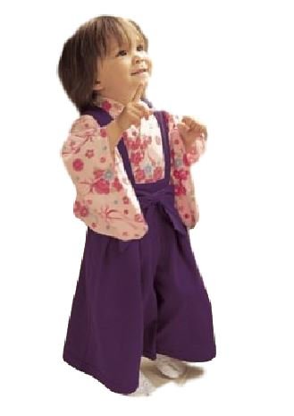 - 上着に和柄の総柄で、フロントウエストには大きなリボンがキュートです。梅模様が可愛らしく映えて凛々しい姿に注目する。
