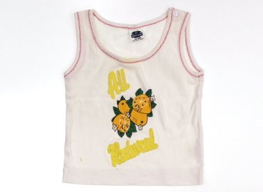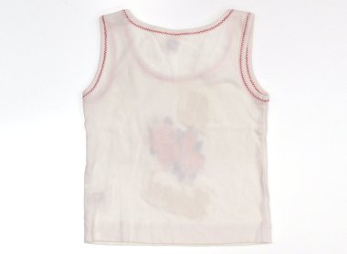 襟ぐり周辺に黄色いシミがあります。他は目立つ汚れ等はなく、しっかりとしたカットソー素材でまだまだ活躍してくれそうです。