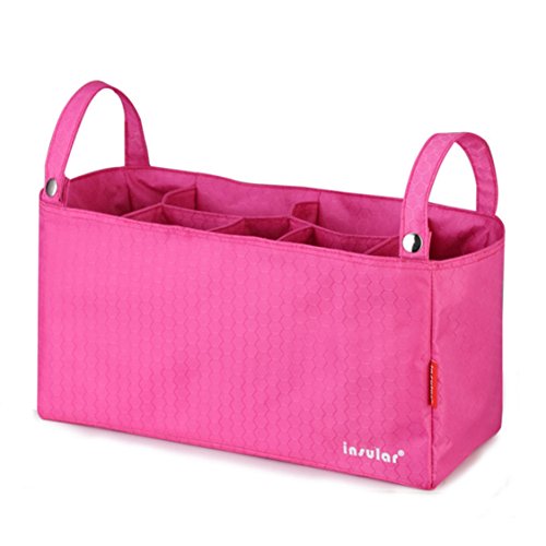 カラーバリエーションが充実した、マザーズバッグ用途のミニバッグです。大きめトートなどのバッグインバッグとして、ベビーカー用収納バッグとして、また、お部屋を移動するときなどに持ち運べる小物入れバッグとして、3Wayで使えます。防水生地で、底面を広げると単独でも自立するしっかりした丈夫な作りです。内側には7つのポケットがあり、大きさも大小ありますので、赤ちゃんに必要な哺乳瓶やおむつ、タオル、おしりふきなどを取り出しやすく整理整頓できます。仕切りの下部は固定されていませんので、入れる物によって多少場所の融通が可能です。小さな物は下部の隙間を移動する可能性があるので、小物入れにまとめてポケットに仕舞えばスッキリします。おうちでの移動時の小物運びや、ベビーグッズいっぱいのお出かけに重宝するお品です。サイズ:幅34cm×奥行14cm×高18cm、重さ:約350g。