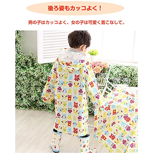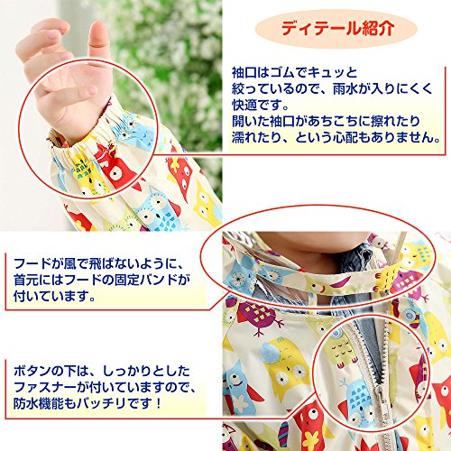 可愛らしいフクロウ柄の、男女兼用レインコートです。雨の日も楽しくなるかわいらしいデザインです。フードの前側は透明になっているので、視界が遮られず安全です。透明バイザーもついています。携帯用収納ポーチ付きでお出かけ時の持ち運びにも便利です。Sサイズ(着丈 約53cm、推奨身長75cm-85cm)、Mサイズ(着丈 約57cm、推奨身長85cm-95cm)、Lサイズ(着丈 約62cm、推奨身長95cm-105cm)。6ヶ月間の保証書がついています。