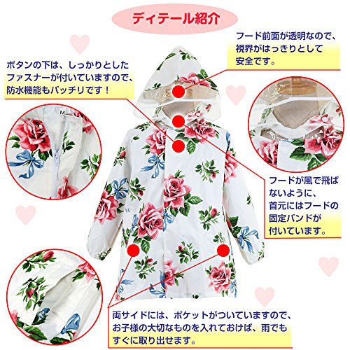 - 可愛らしく、美しいバラの花柄の、女の子用レインコートです。雨の日もウキウキ楽しくなる素敵なデザインです。携帯用収納ポーチ付きでお出かけ時の持ち運びにも便利です。