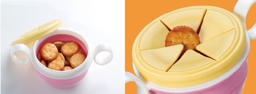 逆さにしても中身がこぼれにくい形状の中フタが、おやつの食べこぼし防止に役立つ。