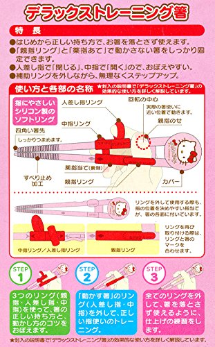 「DXトレーニング箸 ハローキティ キティくまとリボンスイーツ」は、3つのリング(親指・人差し指・中指)を使って、箸の正しい持ち方のコツを覚えるトレーニング用お箸です。指にやさしいシリコン製のソフトリング。先端すべり止め加工。 ご注意 火のそばに置かないでください。