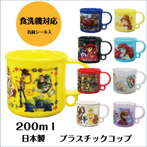 Disney ディズニー 食洗機対応 プラスチック コップ 200ml ・吊り下げ穴付で逆さに吊り下げになるので水切れが良くって衛生的 ・お名前名前シール付 ※本商品はウォルト・ディズニー・ジャパンkkとと契約によりスケーターkkが製造したものです。 サイズ:直径74mm×高さ68mm 素材:ポリプロピレン 耐熱温度140℃ お手入れ:食洗機使用可 日本製