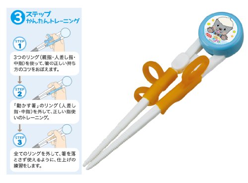 3つのリングで正しい持ち方と動かし方のコツを覚え、次に「動かす箸」のリングを外して指使いの練習をし、最後はリングを全て外して箸を落さず使う仕上げの練習。