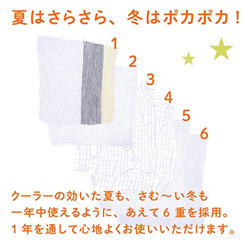 - 【吸湿性・保湿性にすぐれ、夏はさらさら、冬はポカポカ!】1枚目と6枚目は直接に肌に触れるため、糸が細く吸湿性に優れた素材を使用しています。そのため、夏でもサラサラ快適です。ふかふかの空気層を形成させるため2・5枚目はやや太い糸、3・4枚目は最も太い糸を使用したガーゼを組み合わせています。
