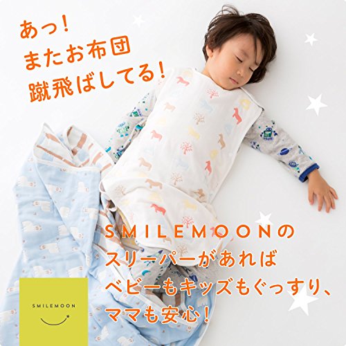 あかちゃんのお肌にも優しい高品質コットンガーゼ100% スリーパー 【ベビーサイズ】 身長60-80cm(1-3歳)【キッズサイズ】身長80-120cm(3-7歳)【30日保証】安心の30日保証です。 あ!またお布団蹴飛ばしてる!・・・ SMILEMOONスリーパーがあれば、元気なベビー&キッズの寝冷え防止に役立ちます!【冬はポカポカ、夏はさらさら!】フカフカのひみつは6重ガーゼがつくる空気層。外側1,6層目は肌触りが良い細い糸を使い、2,5層目の糸はやや太く、真ん中の3,4層目の糸はとても太い糸を使用、空気をたっぷり含む構造です。肌触りもよく、寒い時はあったか、暑いときは素早く汗を吸収し1年を通して心地よく使えます。【1年中使用可能】SMILEMOONが6層を採用しているのは、厚すぎず、1年中使いやすい厚さだから! 寒い冬も、クーラーの効いている夏も、季節の変わり目の春秋も、1年中お使いいただけます! 【楽ちんお洗濯】乾きやすく、お手入れがラク!清潔に保てます。 【楽ちん着せ替え】着脱しやすい高品質スナップを使用しています。おむつ替えもスムーズです。 【丁寧な縫製細かい縫い目で2重に縫い、縫い終わりの処理も丁寧に仕上げています。 【出産祝やプレゼントにも】かわいいパッケージで、長期にわたりお使いいただけるので、喜んでいただけます!