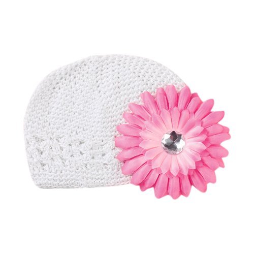 - 白いかぎ針編みビーニー&ピンクのデイジーの花のヘアクリップ